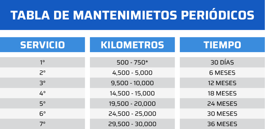 1.- Los servicios de mantenimiento periódico deben realizarse conforme a las operaciones establecidas en el kilometraje especificado en la tabla de mantenimiento periódico o en los talones correspondientes a cada unos de los servicios.